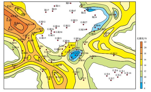 | 图9 清水河组一段储层孔隙度平面分布 Fig. 9 Porosity plane distribution of Member 1 of Qingshuihe Formation |
