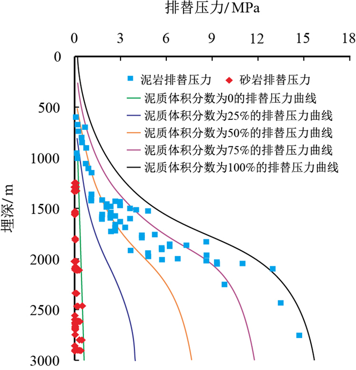 2.1 埋深—泥质体积分数—排替压力关系图版埋深—泥质体积分数—排替压力关系可以通过两种方法求得[23],一种方法是实测法,分别取同一埋深,不同泥质体积分数的岩石样品和同一泥质体积分数,不同埋深的岩石样品做压汞实验,就可以得到不同埋深、不同泥质体积分数下的岩石排替压力。遗憾的是,此种方法需要大量的岩石样品,样品要求高,花费大,作业时间长,不好实现。