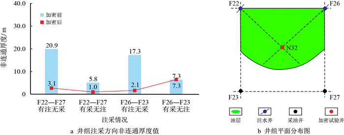 依据井组非连通厚度指标以及其内部砂体平面分布类型,在F区选取4个具有差异性的井组作为小井距先导试验靶区,于2014年加密N32、N33、N34、N35井等4口采油井作为先导试验井(图 10)。从井组非连通厚度指标来看,N32、N33、N34等3个井组加密前非连通厚度较大,分别为51.3、51.0 m和53.2 m,这些井组储层平面非均质性强,井网控制程度低,适宜加密定向井;N35井组非连通厚度较小,仅为23.9 m,储层平面非均质性相对较弱。加密后,N32、N33、N34井组非连通砂体得到有效控制,非连通厚度分别为13.5、9.3及12.9 m,井网控制程度得到大幅度提升,而N35井组加密前后非连通厚度均较小,加密改善程度不大。