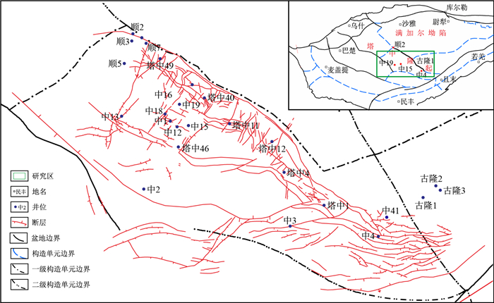 1 区域地质概况塔中隆起,也称卡塔克隆起,北邻满加尔凹陷,南与塘古孜巴斯凹陷为界,西以吐木休克断裂与巴楚隆起相接,东与塔东古隆起相连。整个隆起呈北西向展布(图 1)。塔中隆起断裂整体近东西走向,发育向西撒开、向东收敛的扫帚状断裂体系[16-18]。塔中地区中下奥陶统包括蓬莱坝组、鹰山组和一间房组,鹰山组和一间房组主要受加里东中期运动的影响,造成塔中隆起断裂体系极为发育,形成奥陶系中下统与上统的不整合界面,在塔中地区隆起高部位,一间房组和鹰山组上部遭受严重剥蚀,鹰山组经历了岩溶作用。