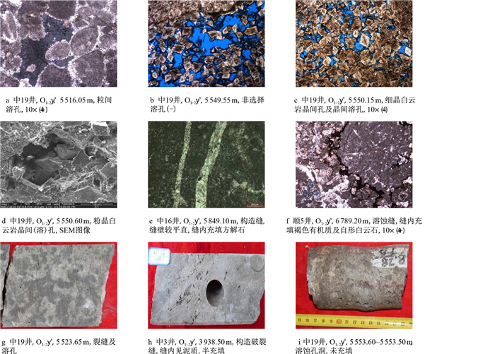加里东中期第Ⅰ幕构造运动发生于一间房组沉积之后,大范围地层抬升导致塔中隆起高部位普遍缺失一间房组、鹰山组上部灰岩段地层。由于受逆断层的控制作用,出露鹰山组下部白云岩段地层,造成大面积的岩溶。在塔中地区范围内,隆起区构造挤压复杂,由于构造作用的隆升,形成一个大的宽缓的背斜构造,下伏碳酸盐岩地层普遍遭受淋滤、溶蚀。由于断层逆冲作用,部分地区地层呈高角度倾覆出露,暴露段造成严重剥蚀,如巴东2井和中13井区,剥蚀厚度相对较大[22-23],地表水沿层面渗滤,沿层进行大范围的溶蚀改造。此外,构造裂缝、成岩缝形成的裂缝系统(图 6),增加了地表水溶蚀的渗滤通道,形成大量溶蚀孔、洞、缝,极大地改善了储集层的储集性能(图 7)。不整合面和顺层岩溶的层面可为油气的横向运移提供有利通道。