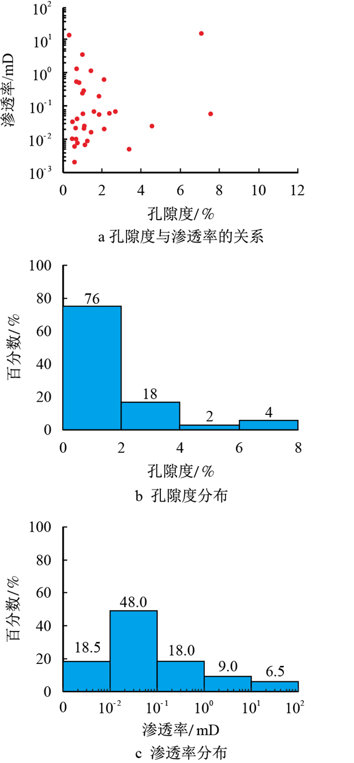 塔中地区孔隙度与渗透率的关系见图 3,可以看出,鹰山组储集体具有孔隙度低、渗透率较低的特点。对鹰山组471块岩芯的孔隙度、渗透率进行测试分析,表明孔隙度为0.25%