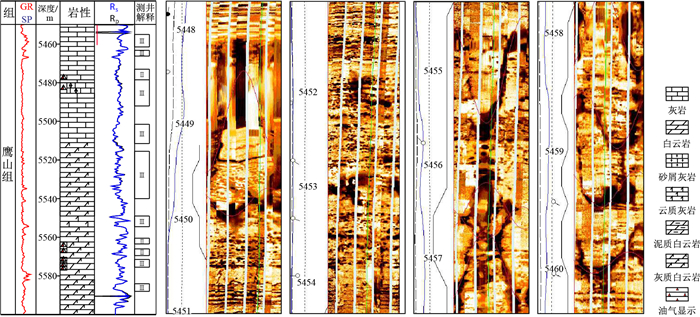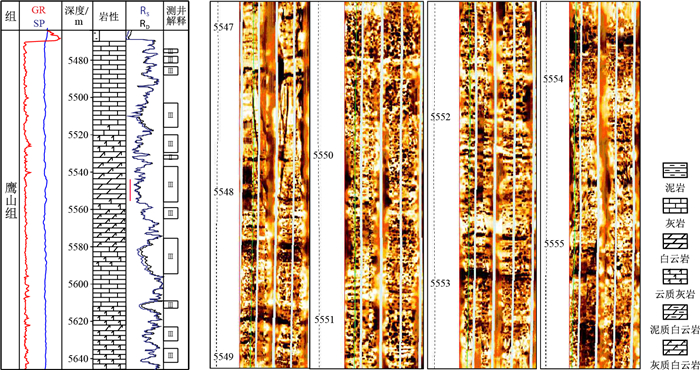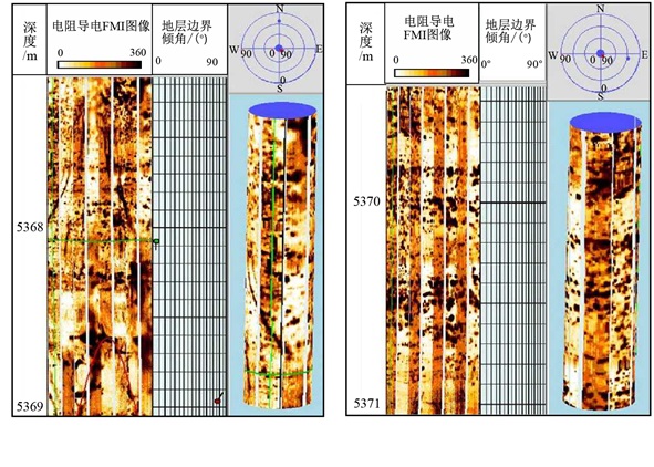 裂缝-孔隙型储集体主要为大气淡水沿裂缝下渗,形成的溶孔-扩溶缝等储集空间。主要发育在垂直渗流带下部,裂缝分布以垂向为主,作为地表水渗滤的通道,储集空间以溶蚀孔隙为主。在FMI成像图显示,裂缝局部切割溶蚀孔,裂缝以高角度-垂直缝为主(图 5),该类储层主要发育在颗粒灰岩中,加之裂缝的沟通作用,可以作为良好的储集体。