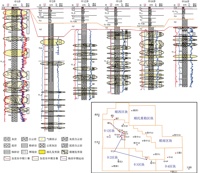 塔中地区中下奥陶统鹰山组碳酸盐岩沉积之后,下部地层经过了短暂的浅埋藏成岩作用后,受构造隆升影响经历多期岩溶作用的改造,主要有加里东中期、加里东晚期、海西早期构造运动[21]。对中下奥陶统岩溶储集体影响最为深刻的是加里东中期和海西早期构造活动(表 2)。
