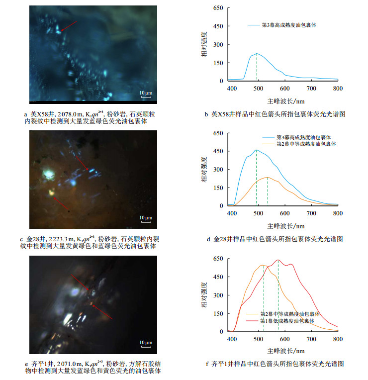 | 图5 齐家地区高台子油层3种荧光颜色油包裹体及其荧光光谱特征 Fig. 5 Three kinds of fluorescent colors of oil inclusions and fluorescence spectra characteristics in the Gaotaizi reservoir in Qijia Area |
