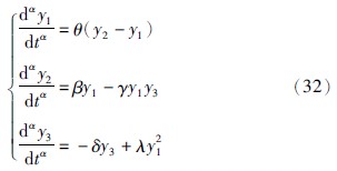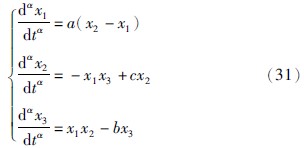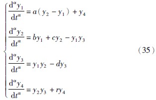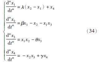 分数阶微积分的提出已经有300多年的历史了,但只是在最近20几年它才成为科学研究的焦点. 人们在许多科学和工程领域都发现了分数阶动力学行为,包括黏弹性系统、 电介质极化、 电极—电解液极化、 电磁波、 生物工程等. 并且,在由分数阶微分方程描述的非线性系统中重新发现了混沌现象和超混沌现象. 比如分数阶Chen系统[8],分数阶洛伦兹系统[9],分数阶Duffing系统[10],分数阶Liu系统[11],分数阶Lü系统[12]和分数阶超混沌Chen系统[13],分数阶超混沌洛伦兹系统[14]等.