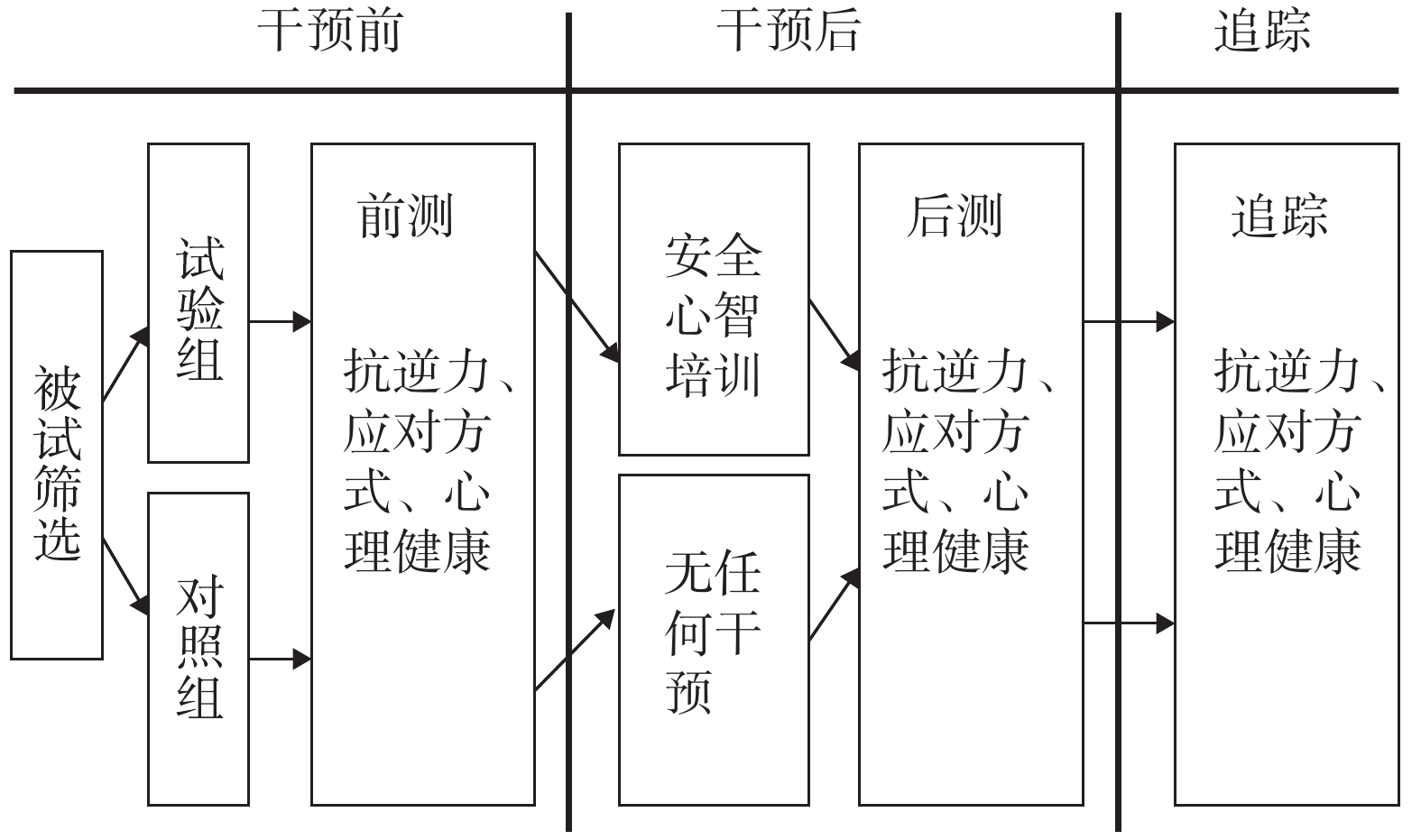 本研究通过设计并实施安全心智培训课程,侧重提升高危行业关键岗位人员的抗逆力,并验证其有效性。本研究采取准实验设计,对实验组进行为期5天的安全心智培训干预。通过对比实验组及对照组的数据及追踪结果,以评估安全心智培训对被试的抗逆力、心理健康水平和应对方式的影响。本研究框架见图1。