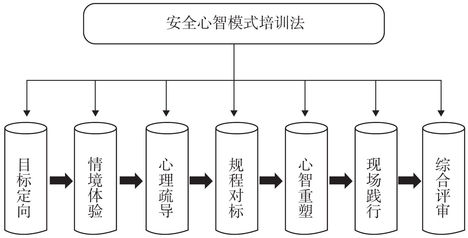 2.4 培训干预方案安全心智培训包括七个步骤(见图2),第一步:目标定向。通过一对一沟通让学员明白自身的安全心智模式与本岗胜任力模型的差距,制定个性化学习目标。第二步:情境体验。通过设置灾难情境,让学员体验伤残人士的生活经历,触动其心理防线,让学员在内心深处形成对安全操作的深刻认知。第三步:心理疏导。通过个体咨询及团体辅导等模式,促使学员改变不合理观念,释放负面情绪,诱发正向情感,乐观面对逆境,理性应对危机。第四步:规程对标。通过案例教学、情境模拟等方式,促使学员掌握煤矿行业通用知识规程和标准,进一步提高其自我效能感。第五步:心智重塑。通过配套录制的3D视频演示等先进手段,促进学员进行技能重塑和认知转变,最终促进其自我效能感的提升。第六步:现场践行。培训结束后,通过回岗实践和工作轮换等方式,达到所学安全心智模式迁移到实践、提升应对危机的抗逆力之目的。第七步:综合评审。通过理论知识、专业技能和与实践操作三个环节的综合评审,全面考察学员在知识、技能和态度等方面的掌握程度,检验安全心智模式的形成效果。安全心智模式的5天培训集中于第二、三、四、五步骤。