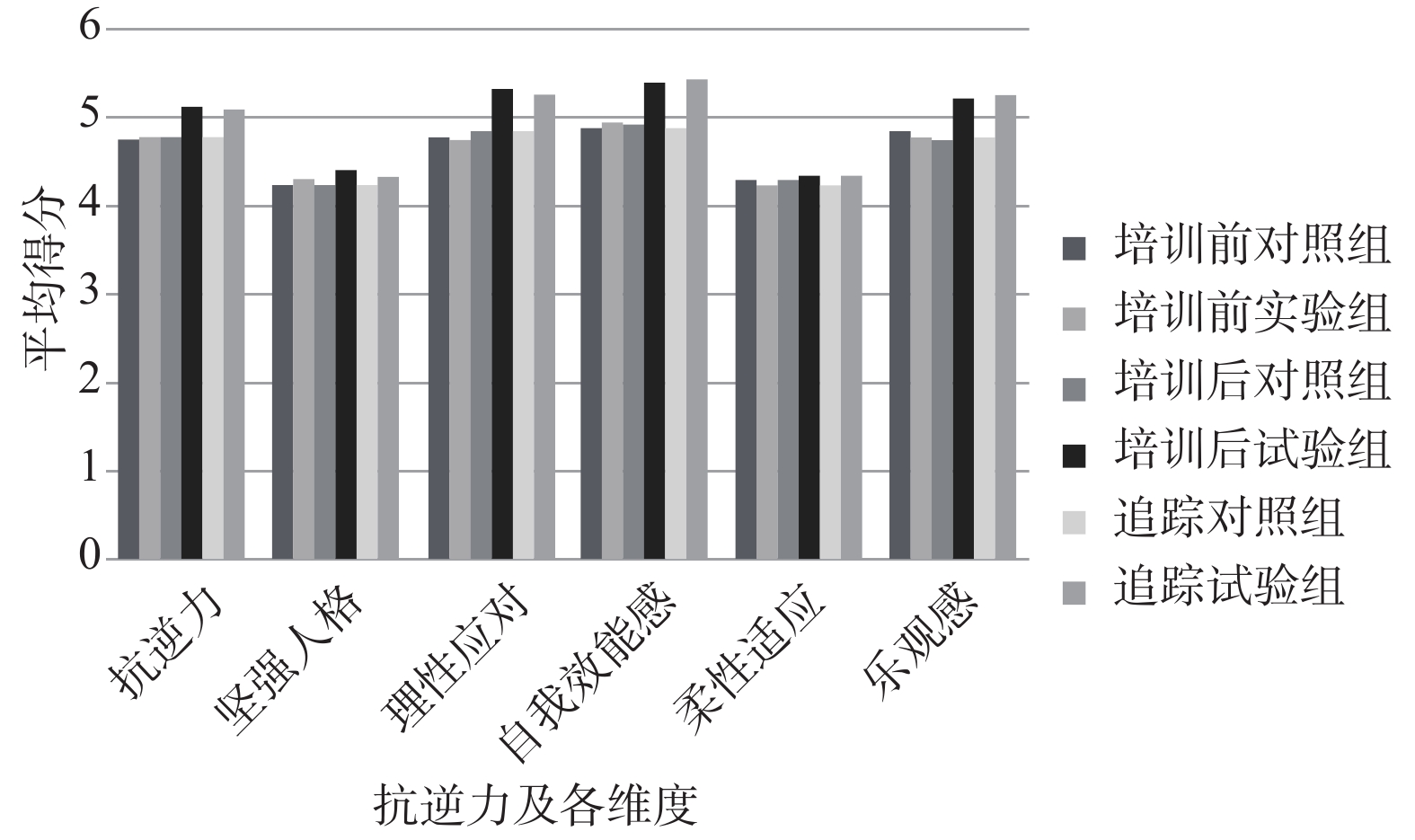 | 图 3 抗逆力及各维度在培训前、培训后以及追踪测量上的分数差异 |