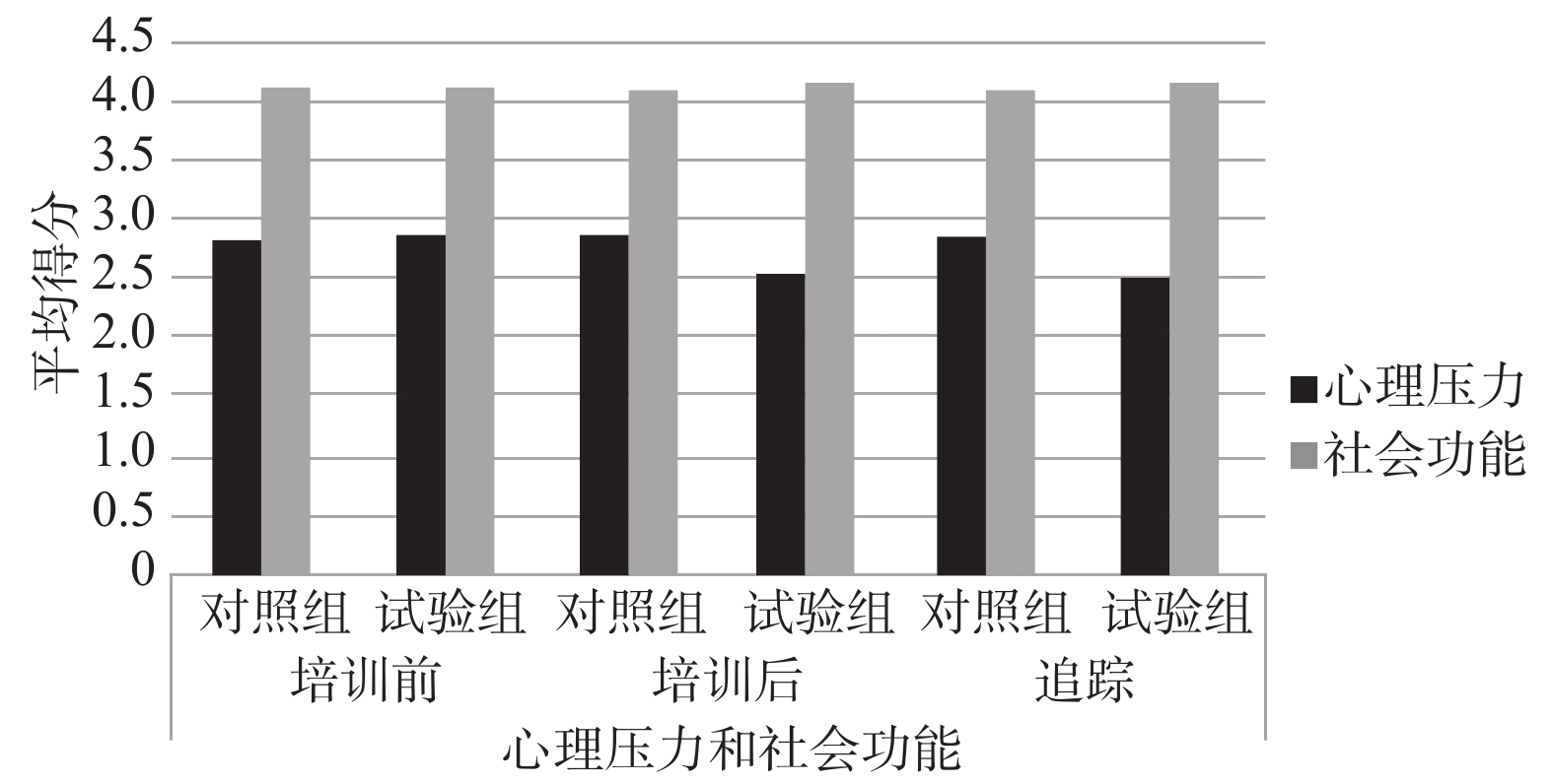| 图 5 心理压力和社会功能在培训前、培训后以及追踪测量上的分数差异 |