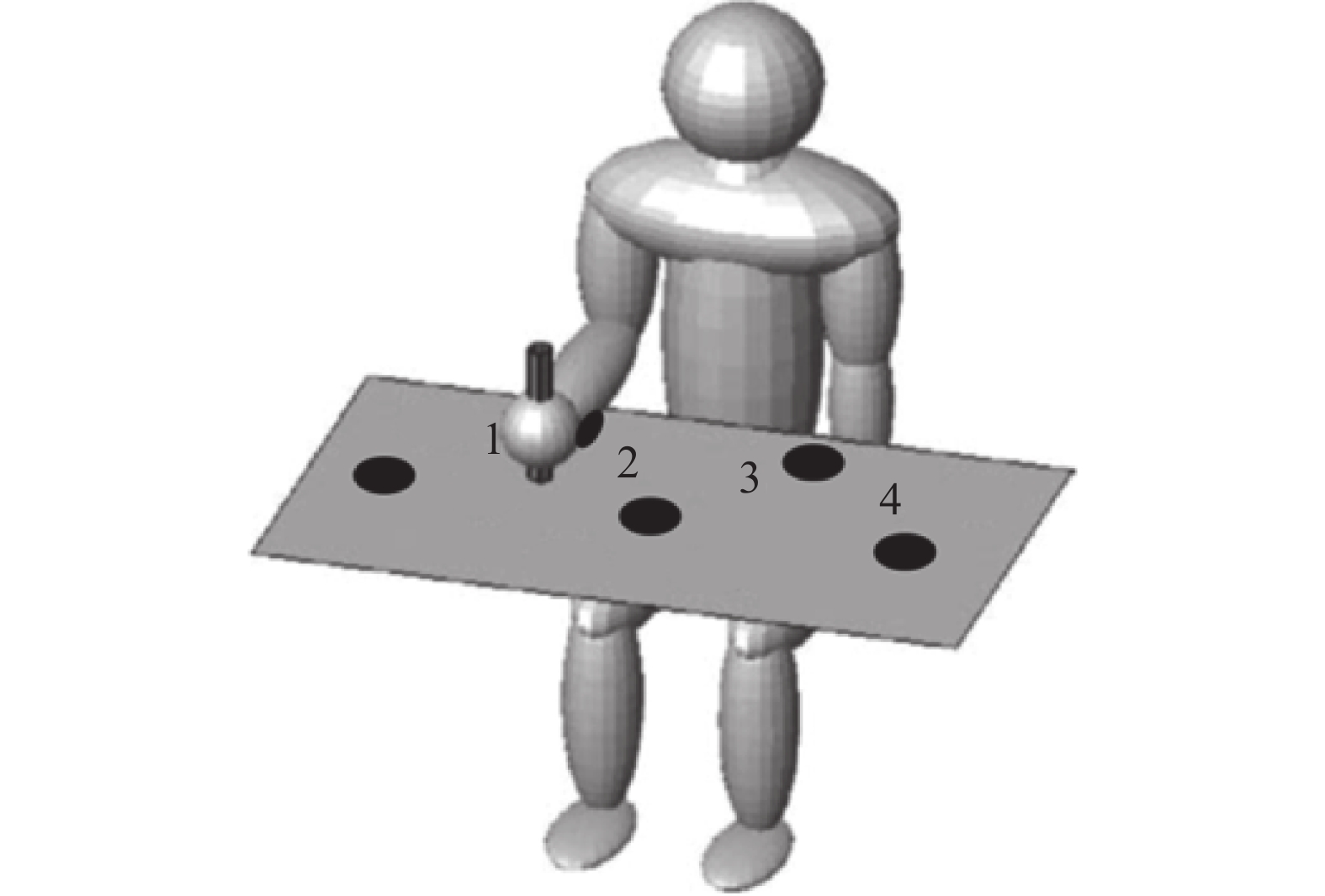 要求被试右手手持一根木棍(高30 cm, 直径2.5 cm, 重125 g),尽量保证右手小指位于木棍低端,木棍处于垂直。被试以跳跃的方式从一个目标位置到达另一个目标位置,跳跃过程中木棍垂直于桌面。