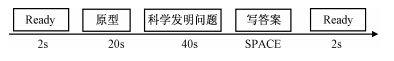 “1对1”范式如图 1所示。首先呈现2s的“Ready”,随后呈现一个20s的原型,要求被试在20s内学习理解原型,理解后立即按空格键(20s内没有按键原型自动消失),接着呈现一个与刚刚学习原型对应的科学发明问题,要求被试在40s内想出解决问题的方法,想到答案后立即按空格键(40s内没有按键问题自动消失),然后将答案写在答题纸上,以进行事后评定,然后按“空格”键继续。