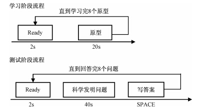 “8对8”范式如图 2所示。刺激流程分为学习阶段和测试阶段。在学习阶段,首先出现2s的“ready”,告知被试刺激即将出现,然后呈现一个原型20s,被试理解后按空格键(20s内未按键原型消失)。直到学完8个原型。在测试阶段,屏幕中央出现2s的“ready”,然后呈现一个科学发明问题40s,要求被试根据前面学习的8个原型中的一个解决当前问题,解决问题后按空格键(40s内未按键问题消失)。然后将答案写在答题纸上,按“空格”键继续。直到解答完8道题。测试阶段写下的答案用于事后评分和统计。