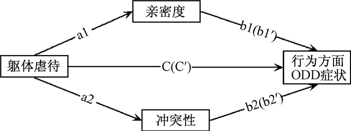 | 图 1 亲密度和冲突性在躯体虐待对行为方面ODD症状影响中的中介作用模型 |