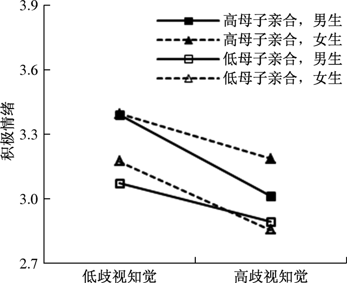 从母子亲合的调节作用模型来看,歧视知觉、母子亲合与性别的三项交互项能够显著预测儿童的积极情绪,说明母子亲合对歧视知觉与儿童积极情绪的调节作用存在性别差异。进一步简单斜率分析表明(见图 1),对于男生,在高母子亲合的情况下,歧视知觉能够显著负向预测儿童的积极情绪(simple slope=-0.23,t=-3.84,p < 0.001),而在低母子亲合的情况下,歧视知觉与积极情绪之间不再存在关联(p>0.05)。从图 1可见,高母子亲合条件下男生的积极情绪均高于低母子亲合,但是,当男生的歧视知觉较高时,高母子亲合对其积极情绪的保护作用会减弱。对于女生,无论在低母子亲合还是高母子亲合的情况下,歧视知觉均能够显著负向预测儿童的积极情绪(simple slope=-0.19,t=-4.82,p < 0.001; simple slope=-0.13,t=-3.17,p < 0.01)。根据Dawson和Richter(2006)的建议,进一步比较了高低母子亲合水平下歧视知觉对女生积极情绪预测作用,结果发现,二者预测作用不存在显著差异(t=1.24,p>0.05)。