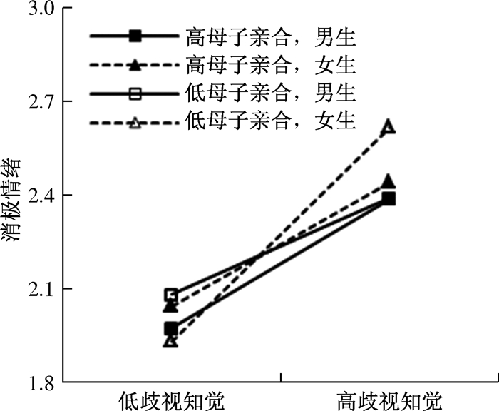 此外,歧视知觉、母子亲合与性别的三项交互项能够显著预测儿童的消极情绪,说明母子亲合对歧视知觉与儿童消极情绪的调节作用存在性别差异。进一步简单斜率分析表明(如图 2),对于女生,在低母子亲合水平下歧视知觉对儿童消极情绪的预测作用(simple slope=0.42,t=9.57,p < 0.001)高于高母子亲合水平下歧视知觉对其消极情绪的预测作用(simple slope=0.24,t=5.54,p < 0.001),且二者预测作用差异显著(t=-2.87,p < 0.01)。换言之,高水平的母子亲合能缓冲女生歧视知觉对消极情绪的正向预测作用。对于男生,无论在低母子亲合还是高母子亲合的情况下,歧视知觉均能够显著正向预测儿童的消极情绪(simple slope=0.19,t=4.67,p < 0.001; simple slope=0.25,t=6.32,p < 0.001),且二者预测作用差异不显著(t=1.48,p>0.05)。