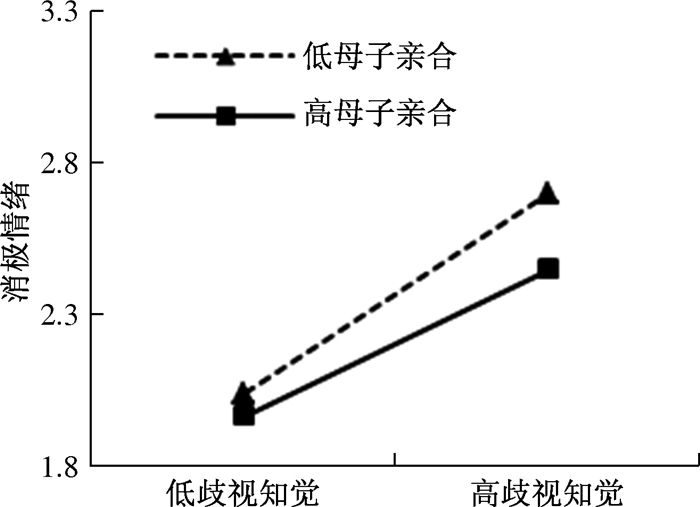 | 图 2 母子亲合性别对父亲外出儿童歧视知觉与其消极情绪关系的调节作用 |