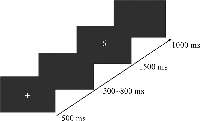 2.3 程序实验流程如下:首先在屏幕中央呈现注视点“+”,持续500 ms;为了避免被试掌握刺激出现的规律而形成定势反应,接着呈现500~800 ms的随机空屏;然后将数字刺激呈现于屏幕中央,按键后刺激消失。若1500 ms内未做出反应,则自动进入下一试次;每个试次之间的间隔是1000ms。所有刺激以伪随机的方式呈现,要求被试尽可能快地准确反应(图 1)。