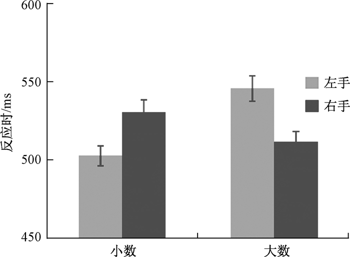 | 图 4 实验三中数字大小和反应手的交互作用 |