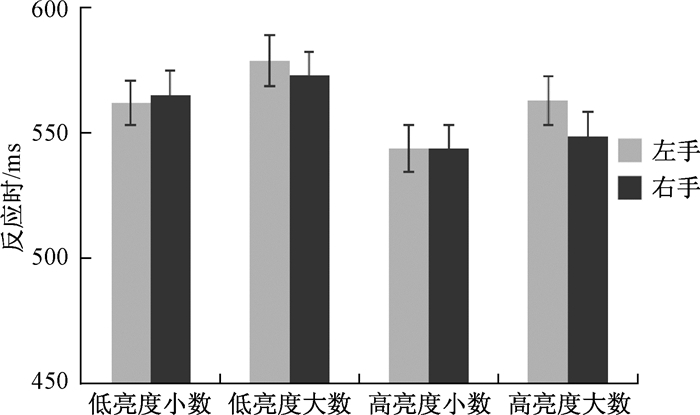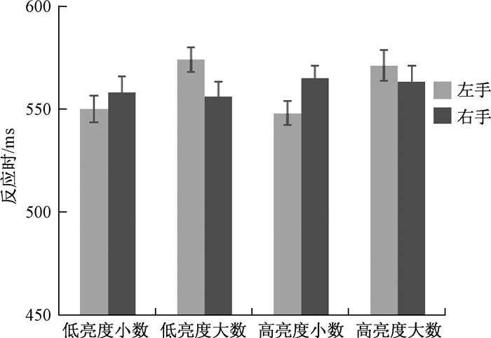 4.4 结果因正确率较高,只对正确反应时进行分析,剔除平均反应时正负三个标准差之外的试次,剔除率为4.7 %。对反应时进行2(数字大小:大数,小数)×2(亮度:高,低)×2(反应手:左手,右手)的重复测量方差分析。结果发现数字大小和亮度的主效应均十分显著,数字大小:F (1, 21)=8.12,p < 0.05,η2=0.28,被试对小数的反应(554 ms)显著快于对大数的反应(566 ms);亮度:F (1, 21)=79.01,p < 0.001,η2=0.79,被试对高亮度的反应(550 ms)显著快于低亮度(570 ms),这可能是由于被试对高亮度的数字易识别使反应更快,而低亮度的数字由于不易被识别使反应更慢。反应手的主效应不显著,F (1, 21)=1.29,p > 0.05,η2=0.06,左手与右手的反应之间没有显著差异(562 ms vs. 558 ms)。数字大小和反应手的交互作用不显著,F (1, 21)=2.37,p=0.14,η2=0.10,这表明数字的SNARC效应消失了。大小和亮度的交互作用不显著,F (1, 21)=0.01,p > 0.05,η2 < 0.001;亮度和反应手的交互作用不显著,F (1, 21)=0.98,p=0.34,η2=0.04;数字、亮度和反应手三者的交互作用也不显著,F (1, 21)=0.33,p=0.57(图 4)。这些结果一方面表明亮度对比值很大时,空间与数字编码间的联系未自动激活,数字的SNARC效应消失了;另一方面,与实验二的结果相似,依然没有发现亮度的类SNARC效应,即被试此时仍未将亮度信息以空间编码的方式表征。