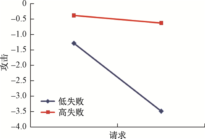 再次,检验高失败的儿童和低失败的儿童在请求行为预测攻击行为的回归方程上的斜率是否显著地不等于0。结果表明,对于低失败的儿童,请求行为对儿童的攻击行为预测显著(β=-1.06,t=-5.74,p < 0.001);对于高失败的儿童,请求行为对儿童的攻击行为预测不显著(β=-0.12,t=-0.24,p>0.05)。调节作用如图 5: