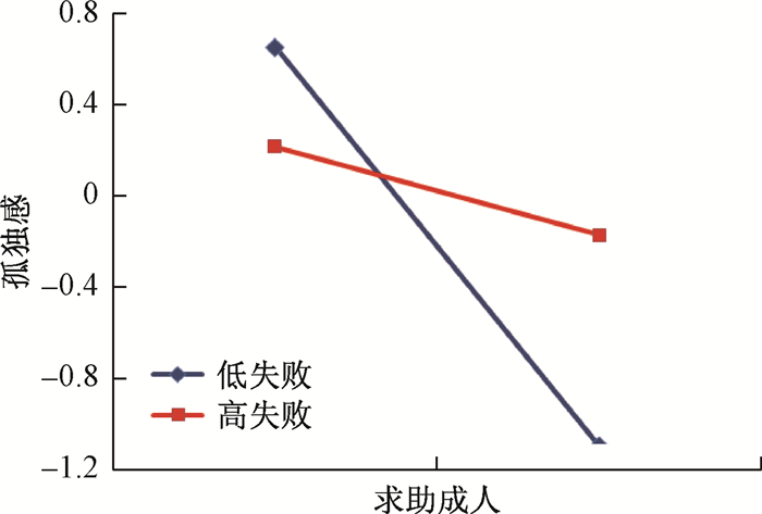 在儿童7岁时的资源获取行为预测其11岁时自我报告的孤独感上,求助成人和资源获取行为失败的交互作用显著,对交互作用作进一步的分析,结果表明,对于低失败的儿童,求助成人对其孤独感预测显著(β=-0.31,t=-45.18,p < 0.001);对于高失败的儿童,求助成人对其孤独感预测不显著(β=-0.07,t=-0.38,p>0.05)。调节作用如图 6: