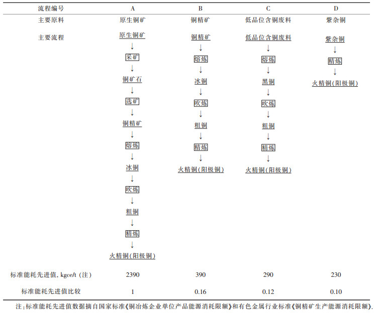 紫杂铜是含铜量不低于90%的废杂铜, 其社会回收量约占全部废杂铜的2/3.紫杂铜经过再生火法精炼成为火精铜.大多数火精铜用于浇铸阳极板, 再经过电解精炼生产阴极铜.部分纯度较高的火精铜直接用于连铸连轧铜线坯(又称铜杆、铜盘条), 或用于浇铸其它紫铜坯.由于紫杂铜再生精炼产业具有流程短、生产和环保投资省、能源消耗较低等优点, 近年来发展十分迅速.火精铜的几种生产流程能耗比较见表1.