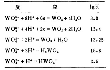 二 热力学数据稳定区域的确定取决于有关的可以应用的平衡常数或可应用于估算这些常数的合理的方法。众所周知,有多种可溶性的钨酸盐存在,然而,它们的生成自由能或稳定常数的数据并不充分,溫度效应的数据也不完全。因此,本文所讨论的只限于25℃和稀溶液的情况,这些条件就工业实践来说是不现实的,它们只是表示稳定关系的趋势,这种趋势有助于强调贯穿于钨浸出过程始终的化学原理。表 1至表 4汇集了用于绘制稳定区域图的热力学数据。