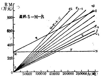 分析图的绘制, 以原矿处理量A为横坐标, 年总成本R和总产值M为纵坐标, 根据(1)——(5)式可作出m——n固定成本线, J——O变动成本线, 和M——I总成本线。根据(6)式M=K·A C。