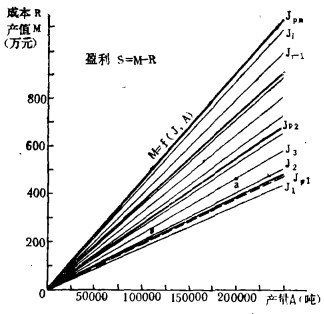 企业生产经营图中, 0——J为贡献边界线; 产值低于0——J时, 为负贡献, 产值高于0——J时, 为有贡献, 贡献等于固定成本时(产值抵销变动成本后, 仍等于固定成本)为盈亏经济平衡。图中M——I为盈亏平衡线。