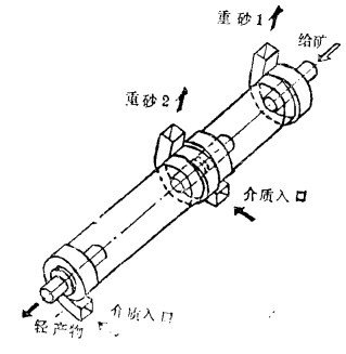 美国制成的D.W.P型(Dynawhirl Pool Separator)(见图 1)动态涡流分选器,它的外形是一倾斜放置的圆柱体。90%的介质由靠近下端的切向管口给入;矿石及约10%介质由上部轴向管口给入。重矿物被旋转的介质层抛向器壁,通过上方的切线排出口排出;轻矿物由下部轴向排出口排出。一台ϕ343毫米D.W.P分选器,给矿粒度为38~0.21毫米,处理能力为80吨/时。该设备结构简单,给入介质压力低,处理物枓粒级范围宽且磨损较小,故自问世以后迅速得到推广。澳大利亚的Mountlsa铅锌选矿厂近年来由于建成规模为800吨/时的重介质选矿车间,加上碎矿、磨矿和浮选车间技术改造,年处理原矿量由200万吨提高到400 0万吨,每吨精矿的直接生产费用降低30%。该厂使用了ϕ400毫米重介质旋流器16台,入选矿石粒度-14 + 0.7毫米,废石丟弃率为30~35%,大大降低了选矿生产成本。