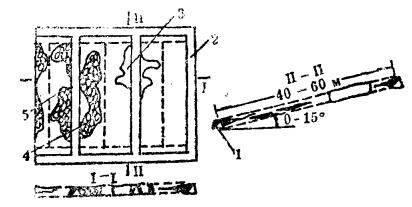 采切布置:此法采切布置主要有阶段脉内平巷(1)和天井以及脉内分段平巷(2)。脉内分段平巷间距一般为10~20米, 主要取决于矿脉沿倾向的多变性和上盘围岩的稳固性。