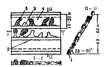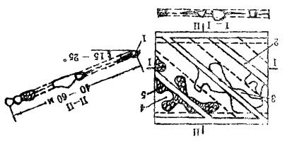 采切布置:采切布置一般只有阶段脉内平巷(1)和脉内伪倾斜上山(2)。脉内伪倾斜上山间距一般为15~20米, 主要取决于膨胀缩小、尖灭复现薄矿脉的多变性。