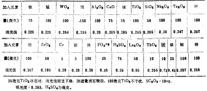 从表 1可见, 大部分元素对钪的测定有干扰, 可用TBP萃取一盐酸反萃取而消除。残留的干扰元素, 可加入混合掩蔽剂进行掩蔽。