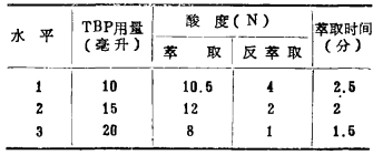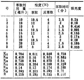 根据正交优选法找到最佳条件组合为A1B3C3D1, 即TBP用10毫升, 萃取时的盐酸酸度为8N, 反萃时盐酸酸度为1N, 萃取时间2.5分为最好。反萃时间没有作为一个因素列入正交表中, 经试验1.5分、2分、2.5分均可。