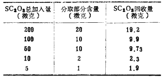 (三) 合成样的回收按黑钨矿单矿物组成配比制成人工合成样1克于高铝坩埚中, 分别加入200、100、50、10、5微克Sc2O3标准溶液, 蒸干, 加4克过氧化钠750℃熔融, 以下按样品分析步骤进行操作, 结果见表 4