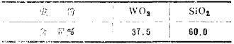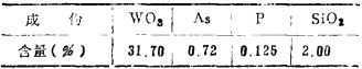 四、 试验及结果1.取50克干渣(成份如表 1)调成体积为100ml的渣浆,采用倒加法加入含HCl为30%的工业盐酸中,加热至60℃,在机械搅拌下分解一小时,过滤后得干粗钨酸18克,废液250ml,粗钨酸成份如表 2,废液成份如表 3。