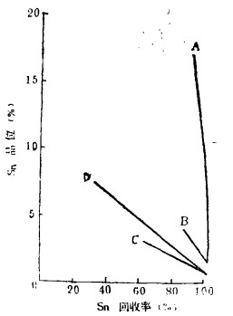 注:1A、D— —MGS型机;B— —螺旋溜槽;C— —细泥摇床。 2、A、B入选原矿90%<75微米,含Sn品位 1.63%。C入选原矿86%<53微米,含Sn品位0.9%。D的入选原矿系C处理的给矿预先用旋流器分级后的溢流,其粒径70%<24微米,含Sn品位0.93%。 图 2 MGS型机与螺旋溜槽、细泥摇床对比试验结果 |