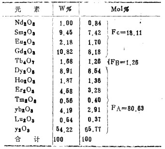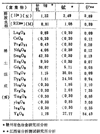 三 结果产品分析结果见表 2, 可见,在未经小试、扩试,按图 1的流程及计算的反萃液流量,在年处理100吨中钇富铕型混合稀土氧化物的工业规模下连续运行一个月,仅在34级混合澄清萃取槽内分别获得了钐铕钆富集物(Eu2O3>9%)、铽富集物(Tb4O7>30%),高钇重稀土富集物(Y2O3>80%)等三种分组产品。该工艺具有产品质量稳定、分离效果较好、流程简单、级数少、投资省、化工试剂耗量少等优点,同时还得到几种适销对路的富集物产品。我们认为这是一条值得推荐的适合中钇富铕型混合稀土进行粗分组的较为合理的工艺。