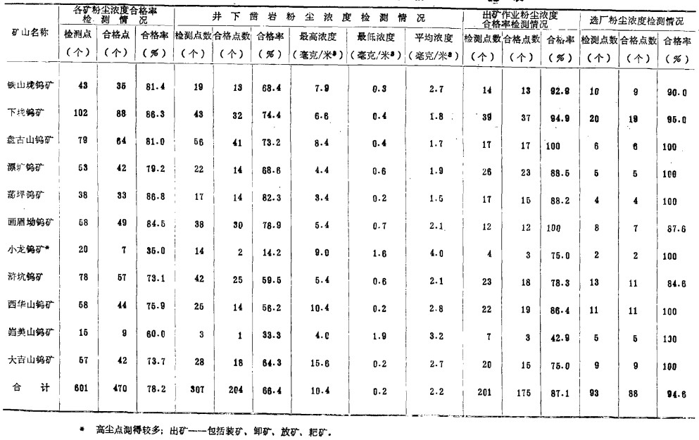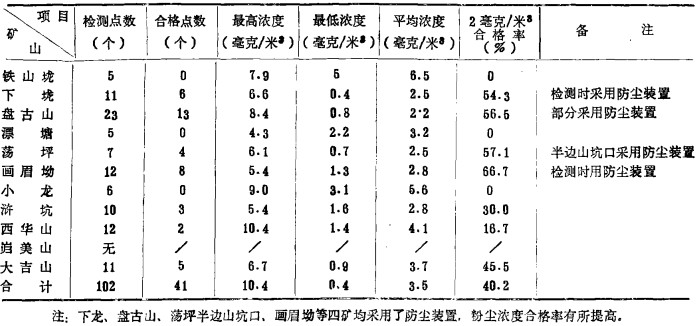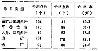 从这次检测可以看到, 少数矿山由于近几年主、客观多种因素影响, 粉尘浓度合格率有较大的波动, 与自测有一定差距。