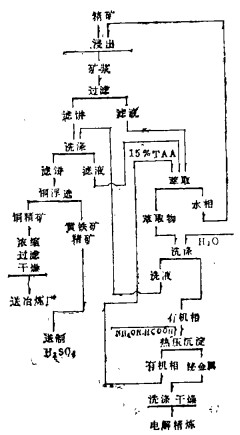 联合工艺(见图)包含铋的催化氧化浸出和浸出液的萃取,以及直接从有机相中热压沉淀铋,硫精矿残渣用泡沫浮选法分出铜精矿。