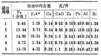 三段逆流浸出,其浸出液含Bi3.21克/升,Cu0.24克/升,Fe + +10.26克/升,Fe+ + +4.4克/升,Zn0.54克/升,pb1.48克/升,H3O+21.6克/升,C1-142克/升。铋和伴生金属在各浸出段的分布率载于表 1。