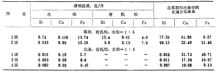 浸出的氯化溶液中的铋用15%的混合第三脂肪胺(TAA)在煤油中萃取,萃取和含铋萃取物的洗涤都在混合沉清器中进行,能力按全相为160克/升时。从表 2可见,2级萃取后,在萃取物中铋的回收率就>99%,残留浓度为0.032克/升,有机相用水洗涤时,从萃取物中排出20~40%Fe,40~50%CU,10~15%Bi。最终得到的萃取物含12.4克/升的Bi,0.62克/升的Cu,4.6克/升Fe,1.36克/升Zn,0.2克/升pb。