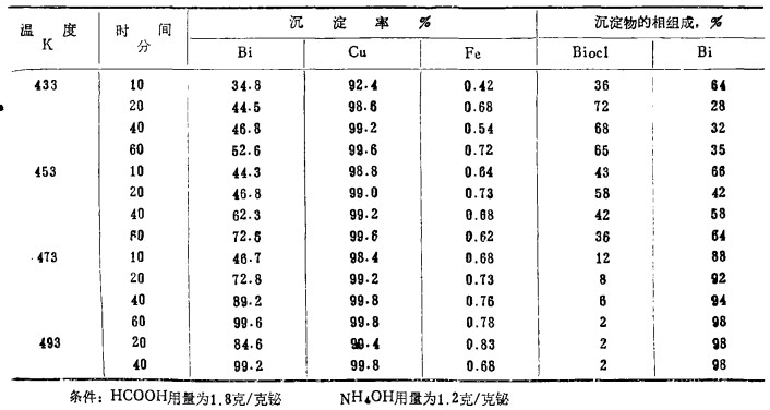 在温度为453k、压力为20.105帕时,在《ГИЛрОНИКЕЛь》研究院的钛质热压釜中进行,加入还原剂一甲酸(1.8克/克铋)和NH4OH(1.2克/克铋),从萃取的有机相中沉淀铋。