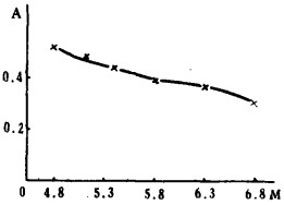 由图可知:溶液酸度在5.4~6.3M范围内吸光度曲线平缓,变化较小,故以6.0M盐酸酸度为宜。