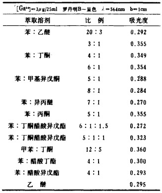 d 萃取溶剂的选择:按照镓-罗丹明B络合物吸收曲线绘制步骤显色后,用不同的溶剂萃取,测其吸光度,试验数据如下: