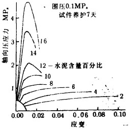 目前广泛使用的胶结充填材料是脱泥尾砂, 这种材料的典型应力一应变本构关系如图 1所示.可见, 当水泥含量低时, 材料的塑性变形或粘塑性流动很明显; 然而, 当水泥含量较高, 或应变较小时, 材料的弹性变形特征也很明显。