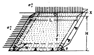 考虑最一般的情况, 若胶结充填体即作为支撑采场围岩的工程结构体, 又作为第二步回采时的自立性人工矿柱, 则取一个已开采完毕并充填满了胶结充填料的采场作为解析模型来研究, 如图 2所示。设其走向方向宽度为W, 高度为H, 倾向方向长度为L, 矿体倾角θ。胶结充填料的力学性质由图 1决定, 充填料的体重为下.取坐标系如图 2所示.为简单起见, 设采场的底板和下盘稳定, 充填体两侧面的矿体为刚性约束, 只有采场的上盘及顶板产生位移并压缩充填体, 则在充填体与围岩的接触带上, 充填体所受的外载荷及自重应力为: