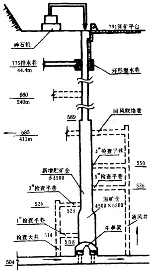 由附图可知, 单一深溜井是全矿生产的咽喉, 由于我矿是"三边"建设的矿山, 溜井设计没有充分考虑到矿山露采大块率高、粉矿含量高、矿区用水多等因素, 溜井放矿系统的结构及辅助设施, 如溜井原矿仓只有15m高, 其上直接和φ2.5m溜矿段连接, 卸矿口固定格筛及碎石机, 774m标高环形泄水巷, 井底振动放矿设施及溜口宽度过窄等, 没有跟上或难以满足要求, 原设计的地质报告对原矿性质认识不足, 设计和实际的数值相差太大, 如:原设计出矿块度大于500mm的占10%, 而实际达50%~60%;同时, 由于没有认识到实际有风化矿(高岭土)及表土矿的存在, 设计小于2.3mm的粉矿含量小于20%, 而实际达30%~40%, 加上粉矿的透水性差、粘着性强, 当粉矿含水率为11.9%时, 粘着力最大, 可达1t/m2, 而粘着力大小是溜井正常放矿与否的一个重要因素:粘着力大, 则流动性差, 易于使溜井发生堵塞和跑矿事故; 同时, 溜井中的裂隙水较大, 在雨季未开泄水巷之前, 每昼夜约有40t, 大暴雨时可达60t, 开泄水巷以后也还有20t左右, 加之对溜井管理缺乏经验, 生产又不正常, 在试生产过程中, 溜井的堵塞、跑矿事故时有发生, 给企业的试生产、调试带来了困难, 影响了矿山建设的进展。