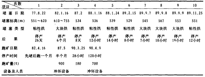 据不完全统计, 在我矿的溜井使用史上, 大大小小的堵塞和跑矿事故达200多次, 现仅举有代表性的几例,列表如下。